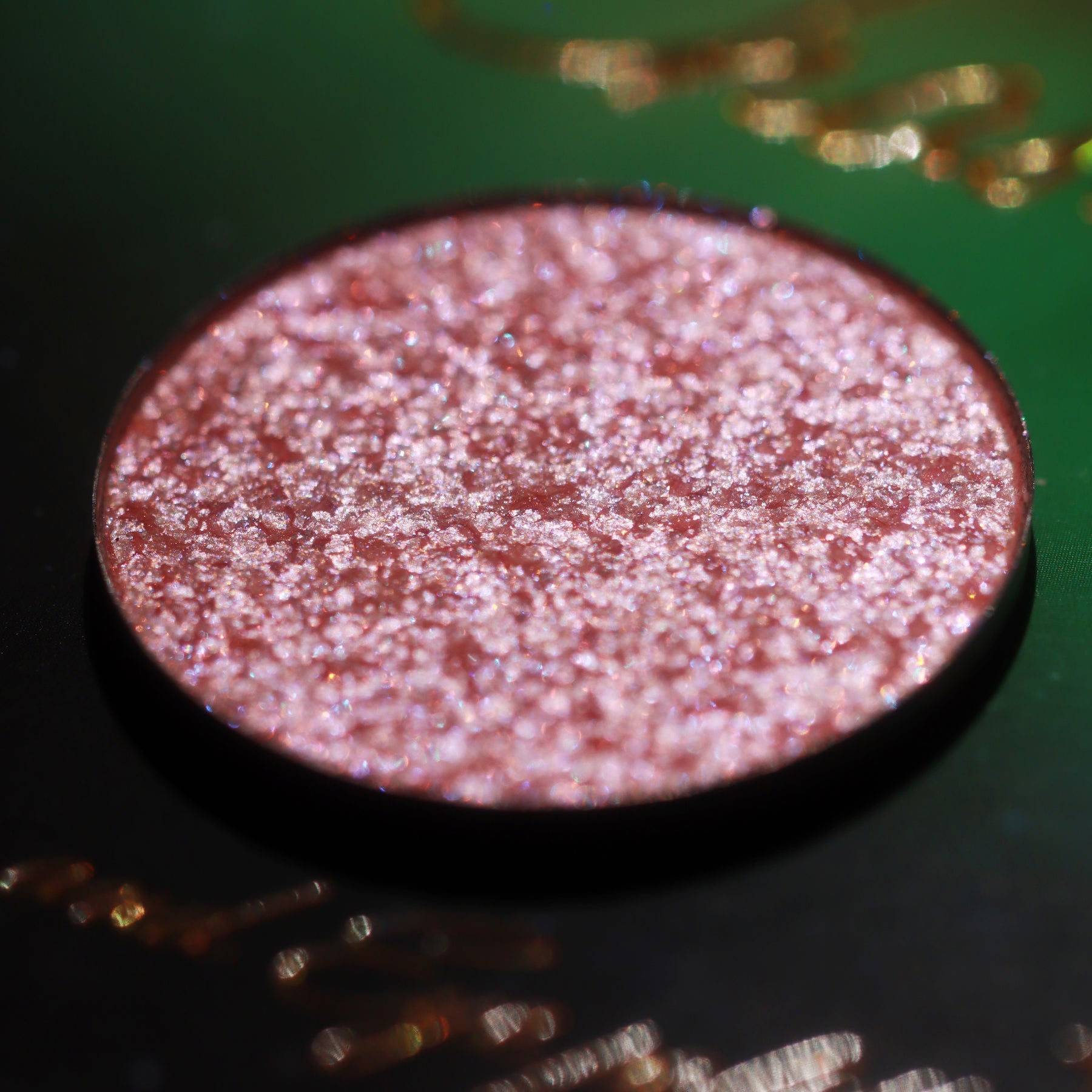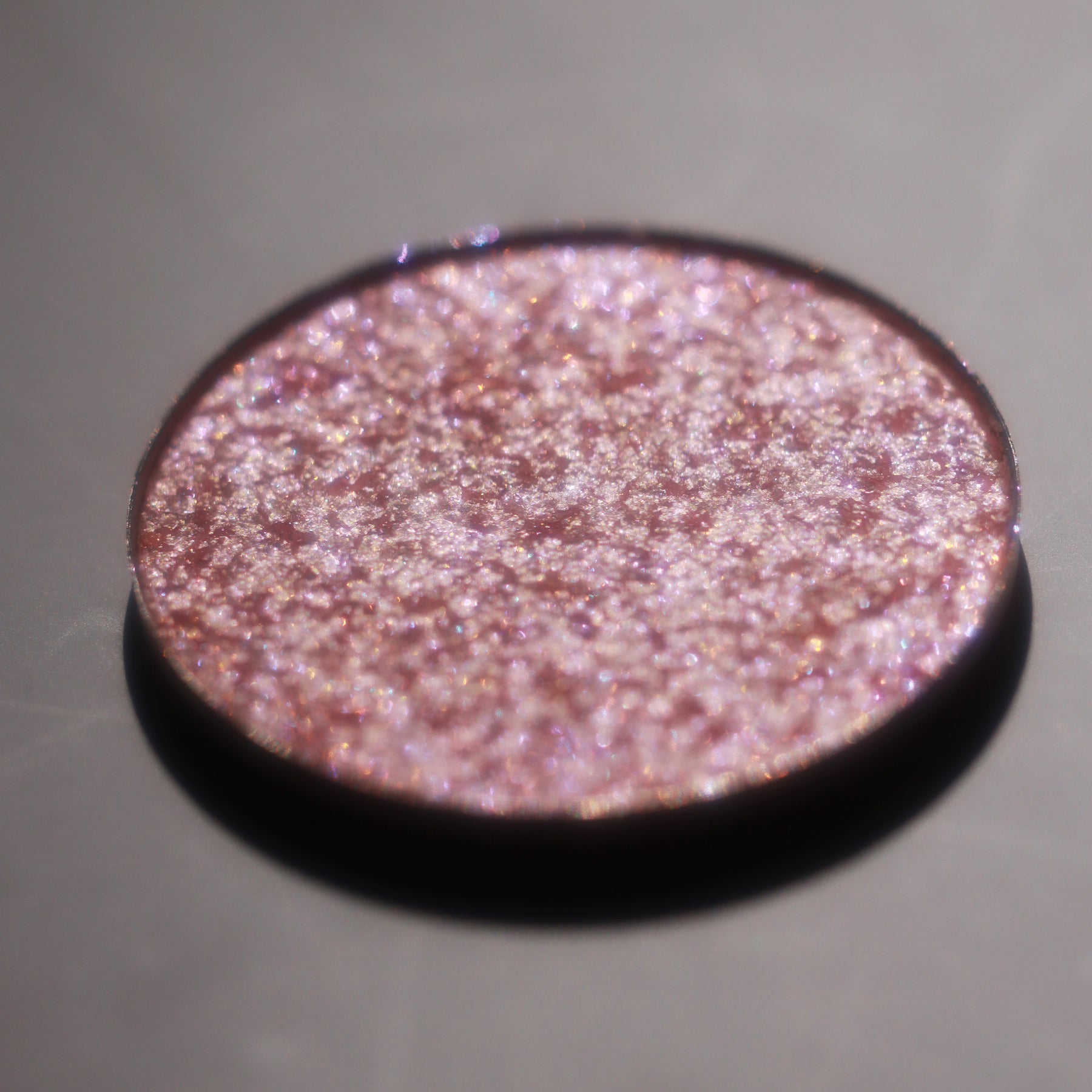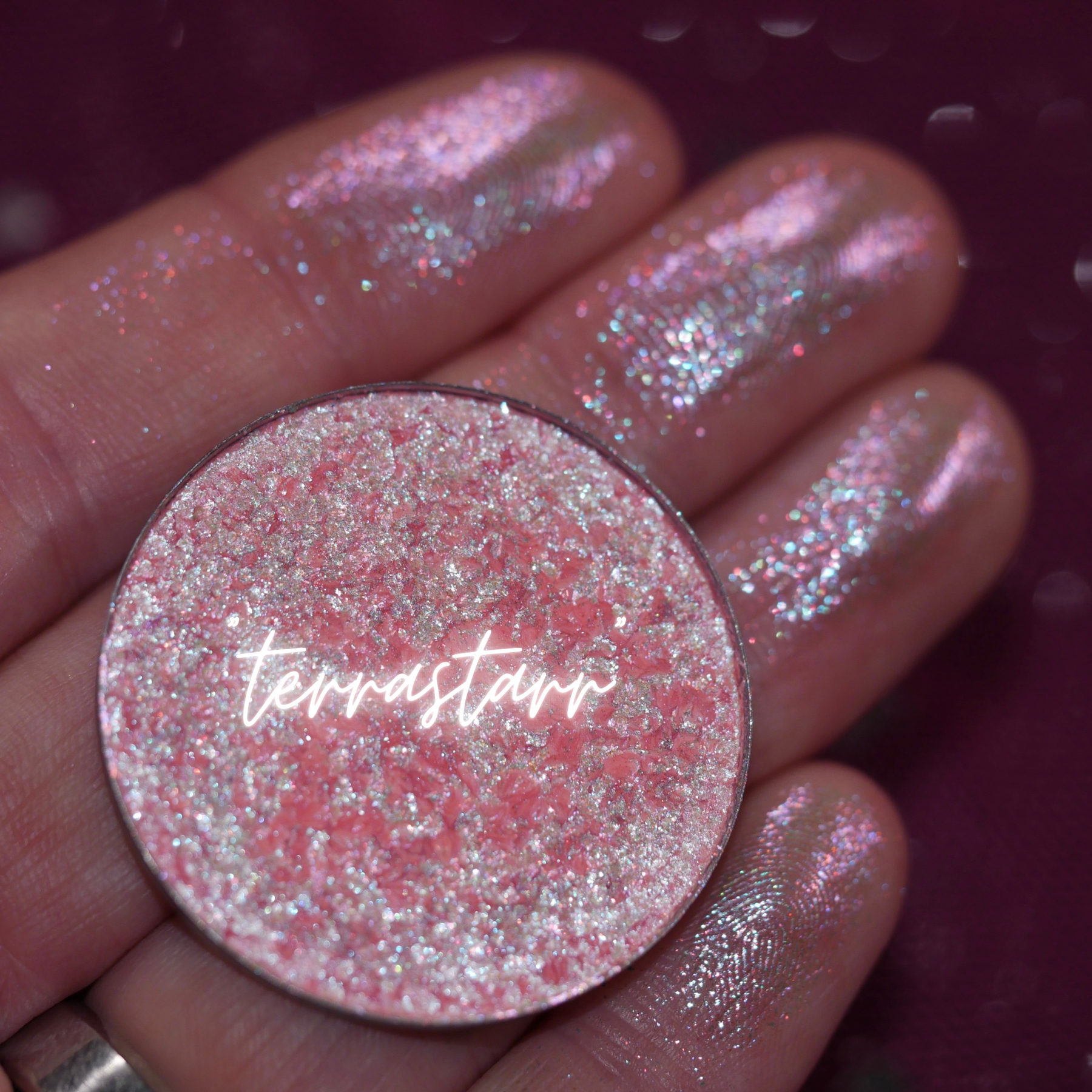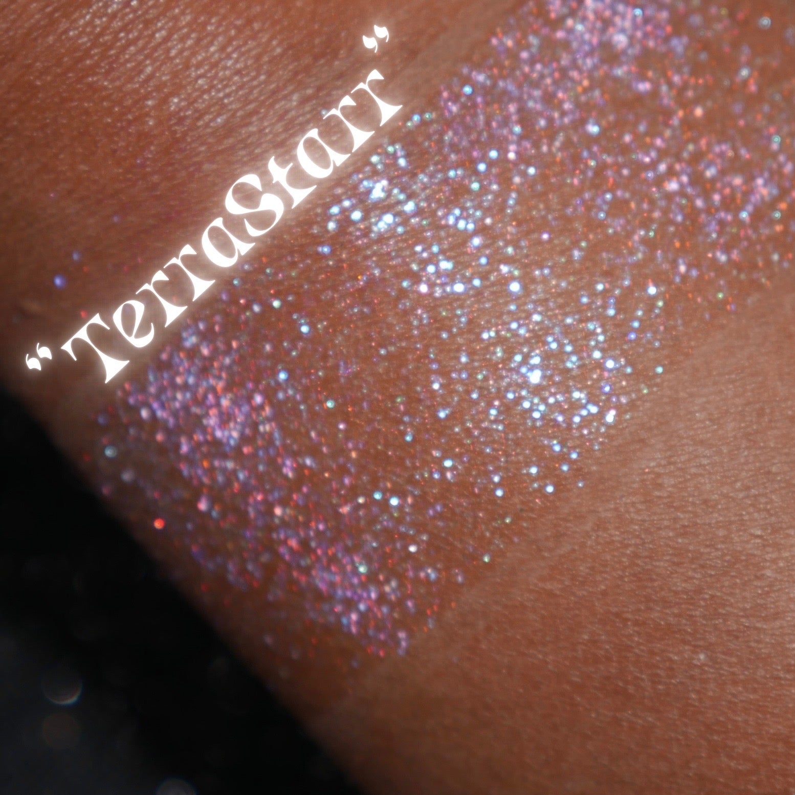 TerraStarr appears as a soft pink in the pan, but applies with a nearly transparent base filled with multicolored sparkle. Despite its intense shine, the texture is smooth and refined. Perfect for a blinding cheek glow, underbrow highlight, or inner corner pop, making it a truly multi-use celestial essential.