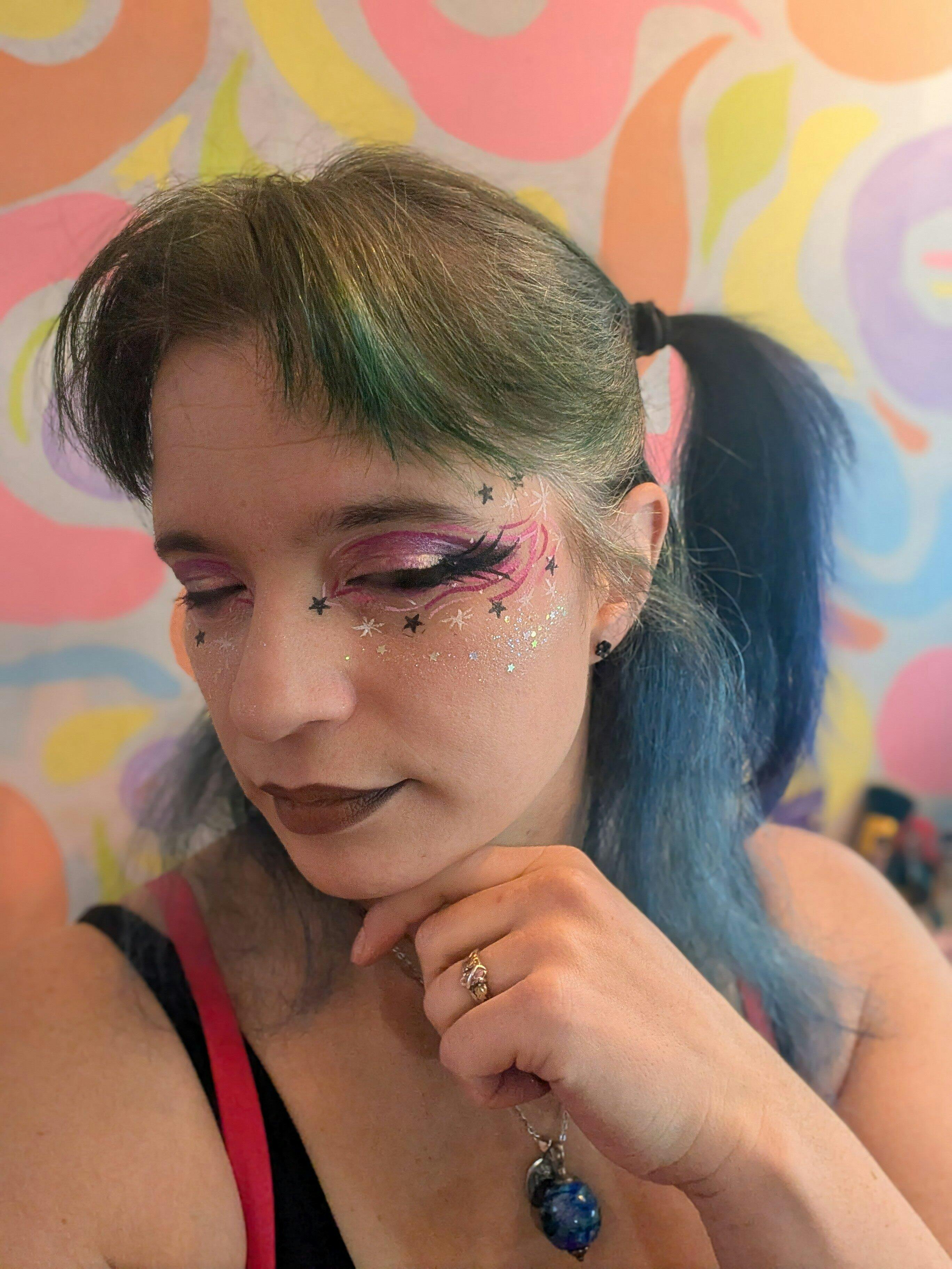 Cosmic Chameleons are color shifting shadows that change their appearance depending on the lighting and angle. They are hybrid shadows between a vivid metallic and iridescent chameleon. These are best applied with a primer, setting spray or a glitter glue to intensify the shift.