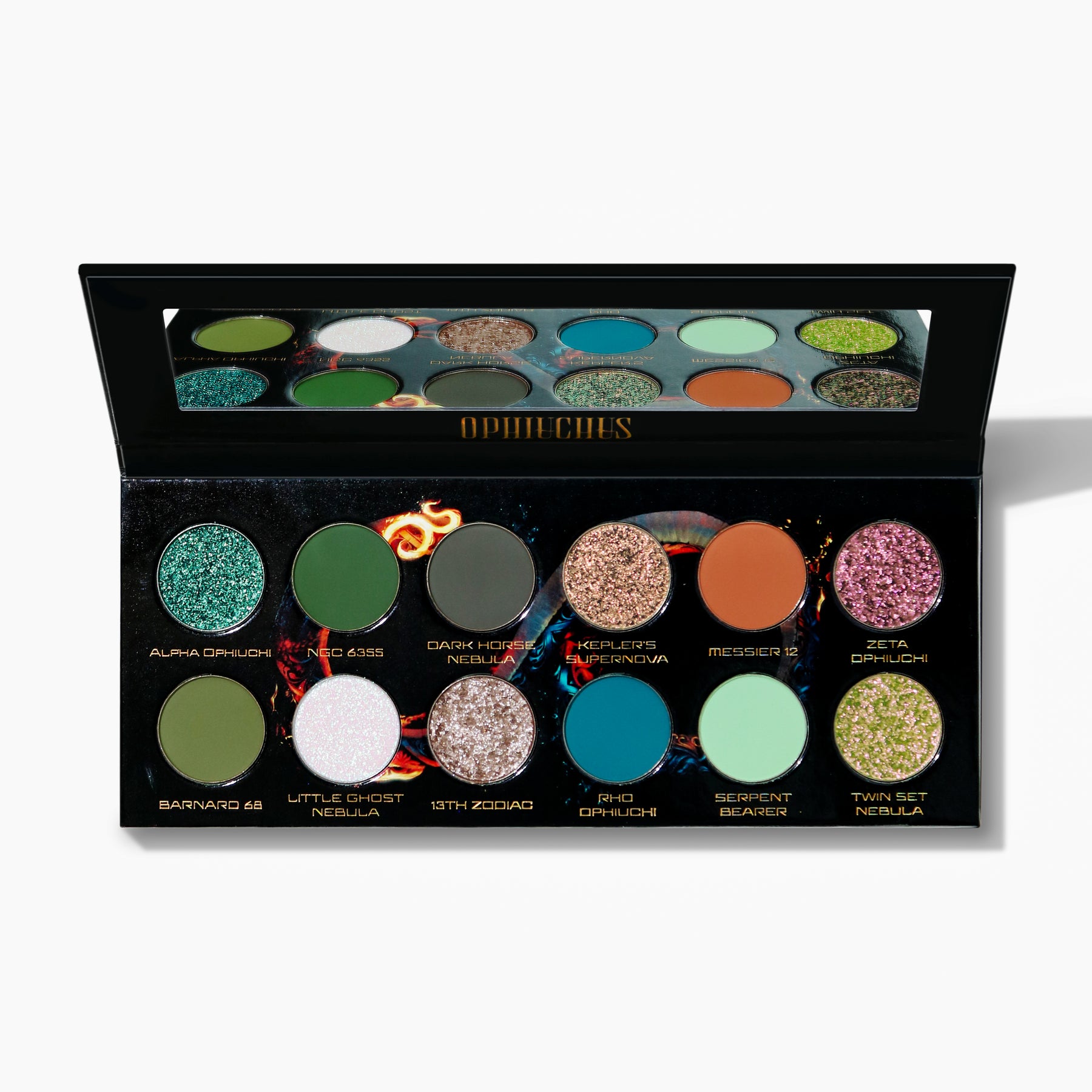 - Alpha Ophiuchi (Duochrome) An electric teal-to-green shift that pulses like a star in motion. Bold, dimensional, and perfect for center-lid spotlighting or full cosmic drama.